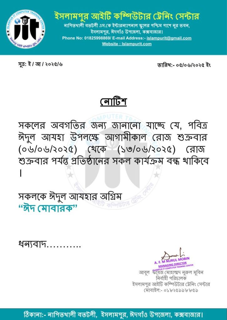 আগামীকাল ( ১৪/০৬/২৫) থেকে আমাদের ইসলামপুর আইটি কম্পিউটার ট্রেনিং সেন্টার এর সকল কার্যক্রম যথারীতি আবার শুরু হবে।